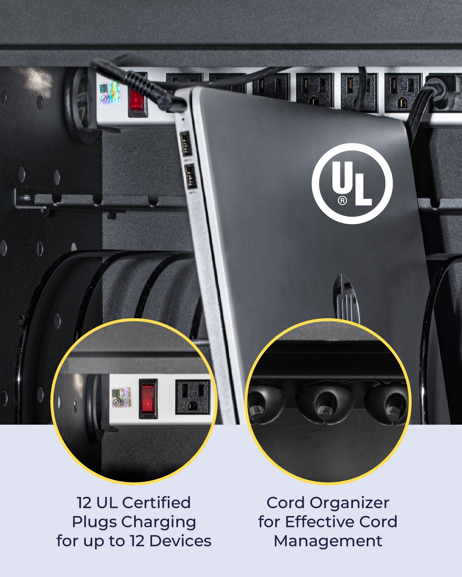 • 12 charging and storage slots that are outfitted with US plug and surge protection certified by UL
