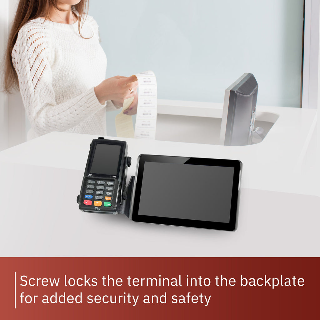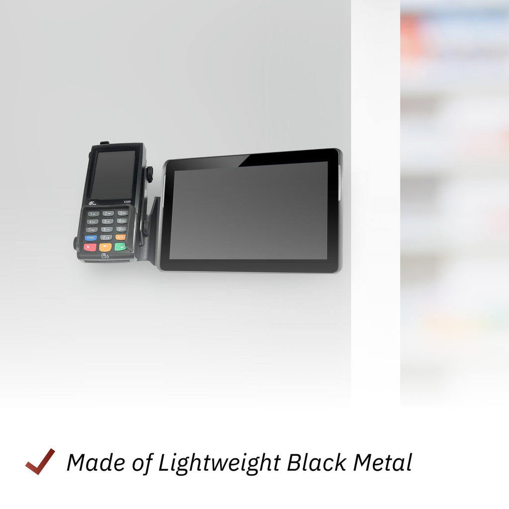 Shown with PAX S300 PINpad, this is a custom bracket that brings the payment device off of the counter, and next to the POS Terminal. The bracket, made of metal with a black coating is secured between the POS stand and the terminal. The bracket cradle for the PINpad comes with two sets of screw holes to raise or lower the height of the PINpad. The mount comes with all of the mounting screws for the install. This solution is ideal for Server and Bar POS stations. The POS mount on the bracket has holes for both 70mm and 100mm VESA mounts. VESA mounts are the four screw holes that come standard on the back of a monitor/display.