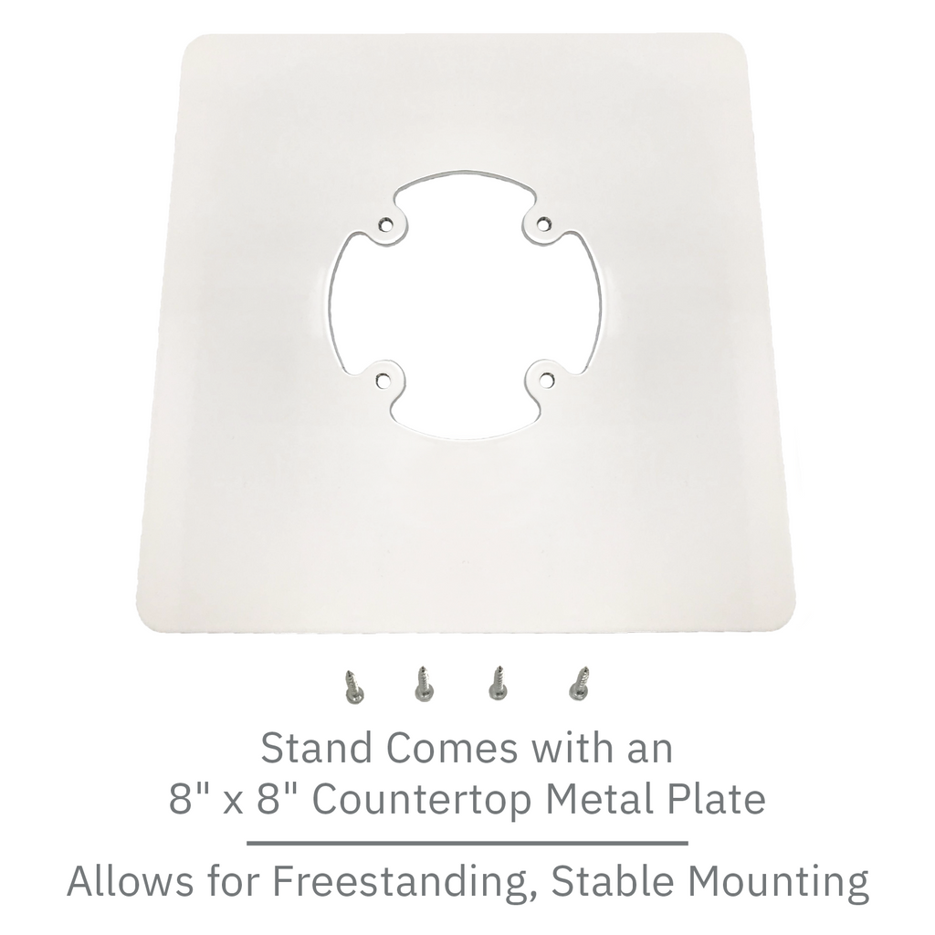 - Includes 8" x 8" square countertop plate which increases flexibility and allows the mount to be freestanding. Simply screw the stand to the plate with enclosed screws.