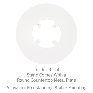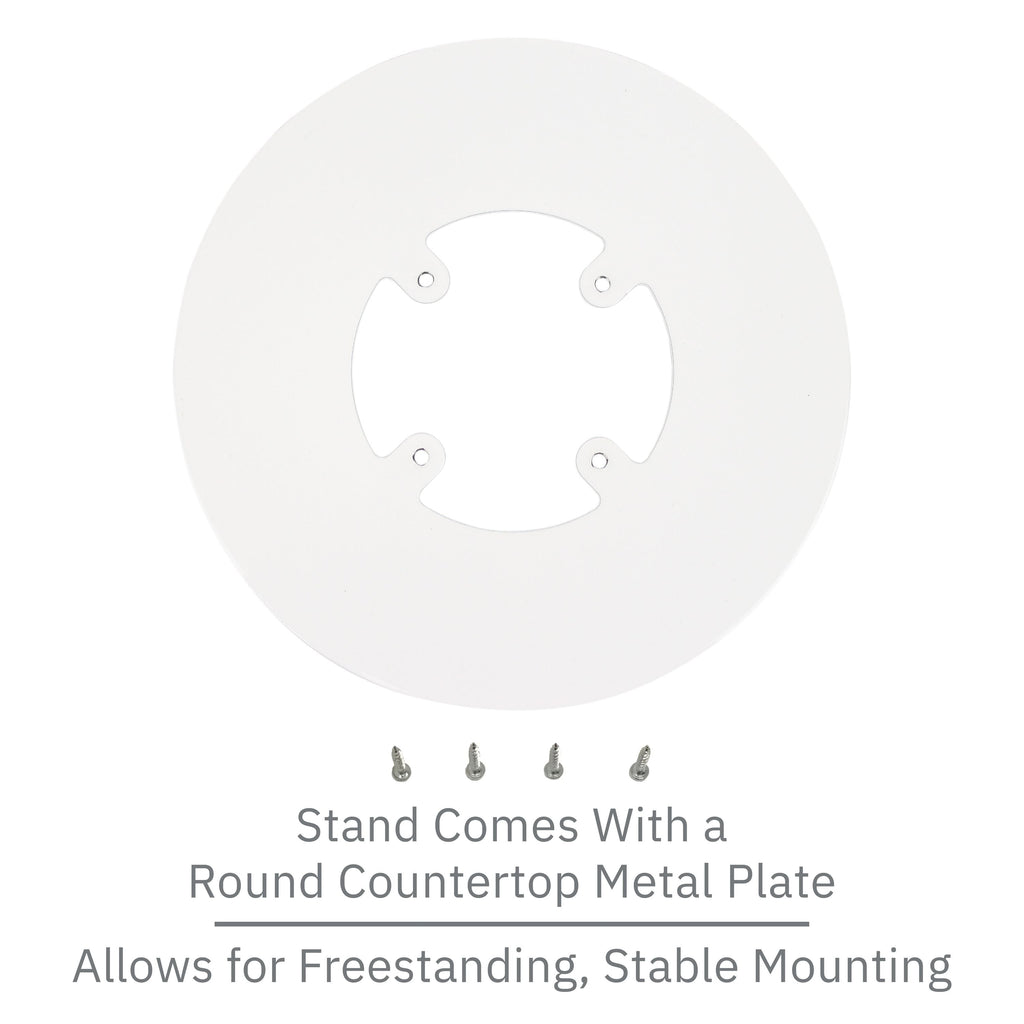 - Includes 8" x 8" round countertop plate which increases flexibility and allows the mount to be freestanding. Simply screw the stand to the plate with enclosed screws.