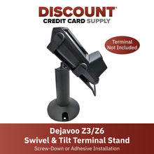 - Swivel and tilt stand is supplied fully built for a simple installation; two easy installation methods; includes screws and an adhesive pad for two options of securing holder; terminal not included; fits Dejavoo Z3 / Dejavoo Z6 ; pole stands 5.5” tall