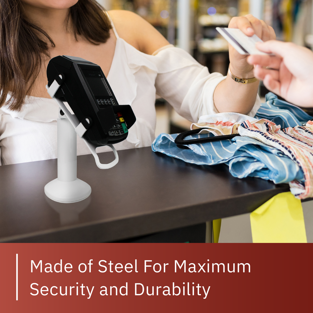 - Stand allows for seamless customer interactions with less danger of harm to equipment; flange cover hides wires and mount keeps terminal secure for minimized chances of damage and theft to POS terminal; durable powder coated finish protects stand