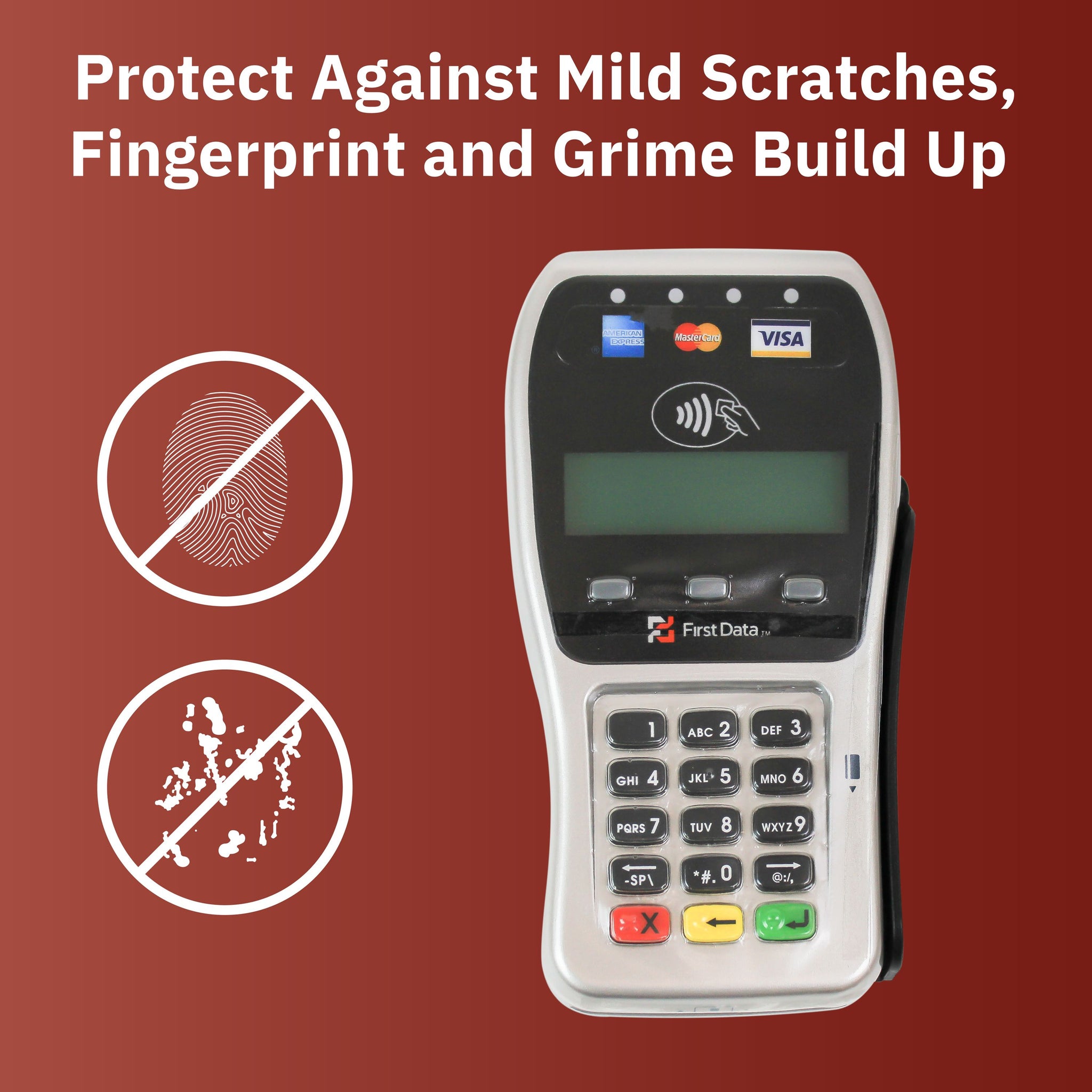 Our POS touchscreen protector fits a First Data FD35 payment terminal. The full device cover is custom designed for the First Data FD35 payment terminal to make your in-store card purchases easier. The POS cover reduces the need for expensive screen and keypad repairs. The spill cover is easy to install, flexible, transparent, and durable. Easily wipe down and disinfect your POS terminal and stand all at once. The POS screen and keypad protectors against mild scratches and helps prevent fingerprint and grease build up. The flexibility and transparency of the cover keeps the screen clear and touch sensitivity consistent.