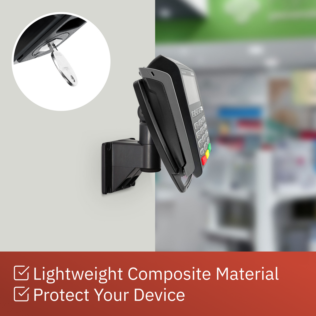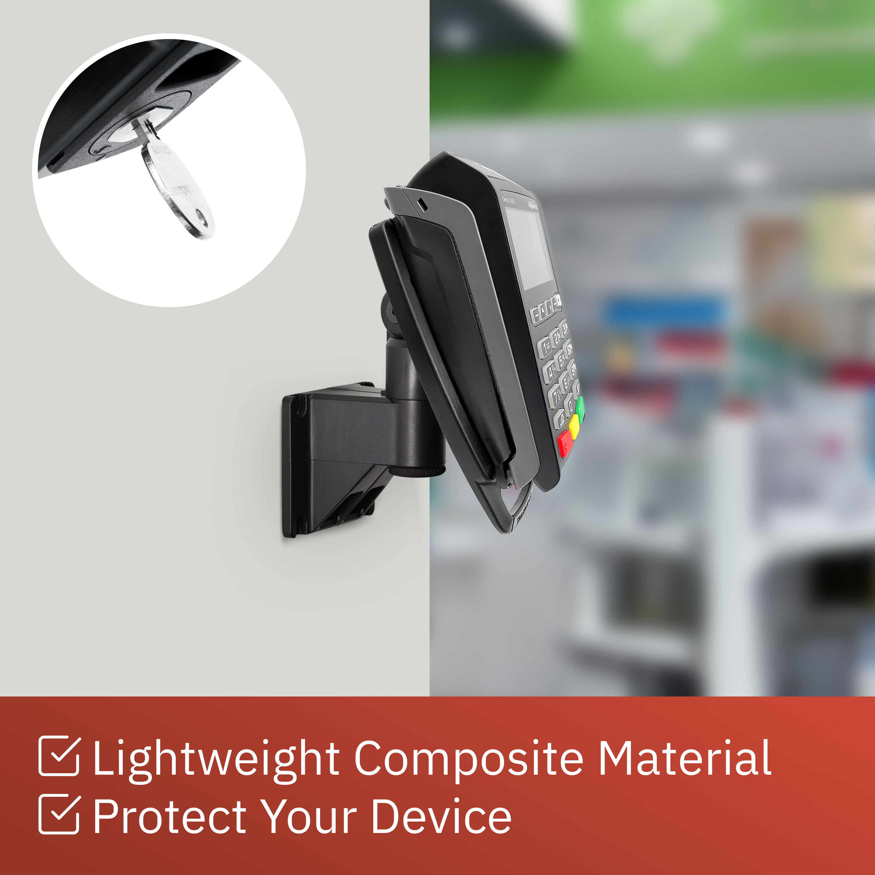- Unique 'latch and lock' mechanism located behind the custom back plate secures your terminal to the 7'' wall mount; black composite stand securely holds terminal in place with custom back plate; protects countertops by removing POS device from area