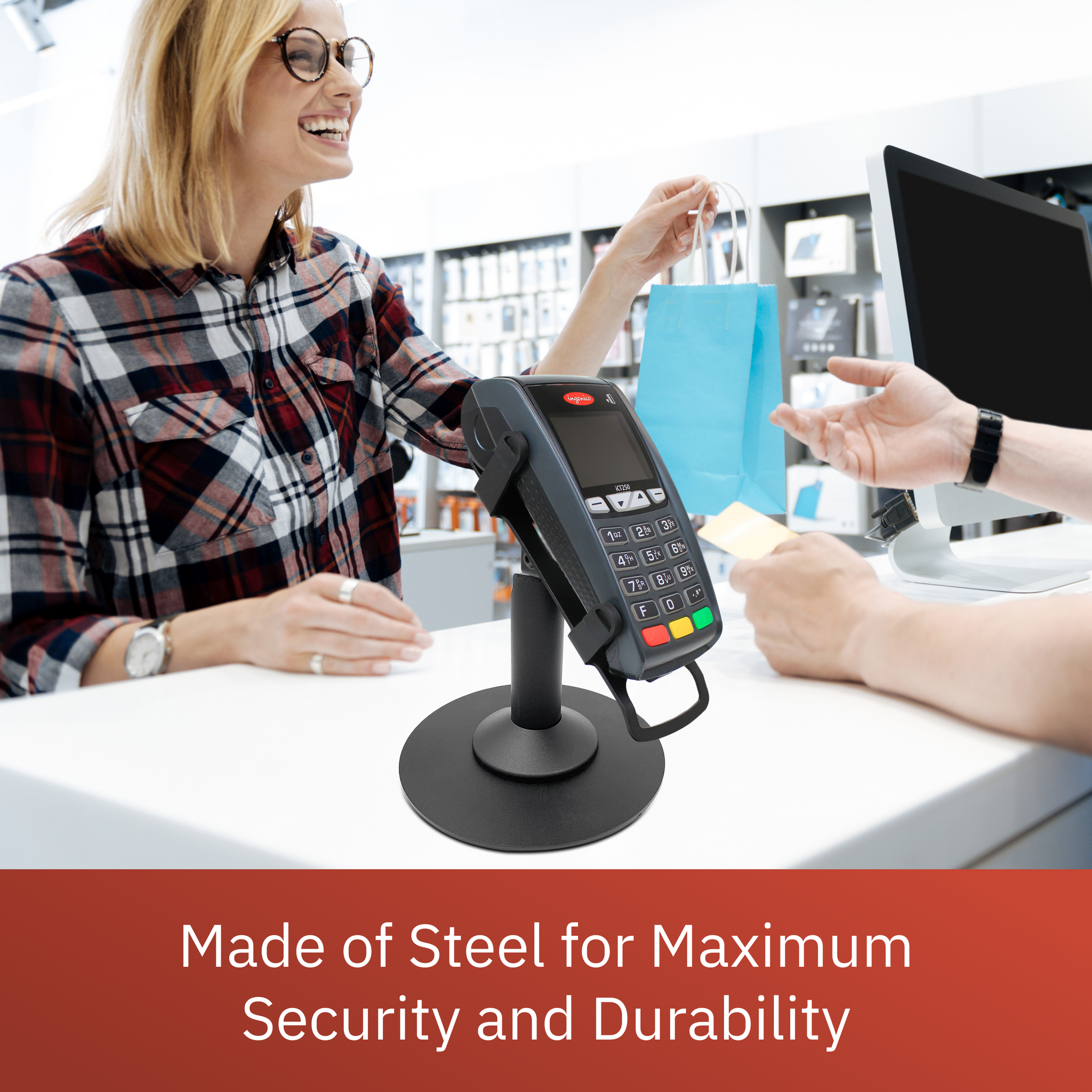 • Essential to enhance customer experience; POS terminal stand is great for customers and merchants; stand can tilt up to 60° and swivel a full 190°, making moving device from customer to merchant easier; improves payment transaction