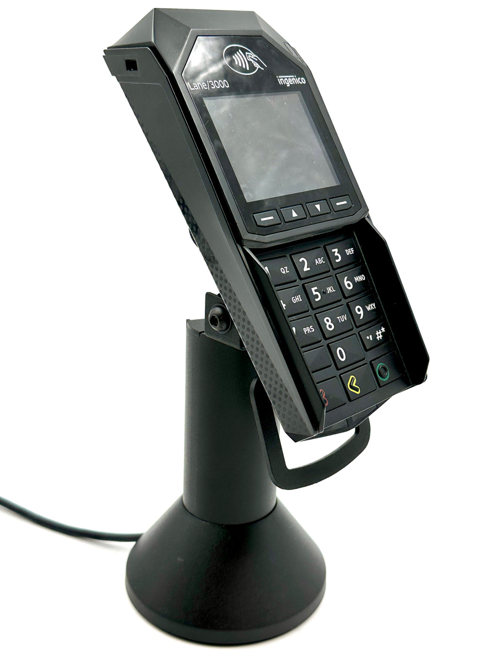 - Swivel and tilt stand is supplied fully built for a simple installation; two easy installation methods; includes screws and an adhesive pad for two options of securing holder; terminal not included; fits Ingenico Lane 3000 / 5000 / 7000 / 8000; pole stands 5.5” tall