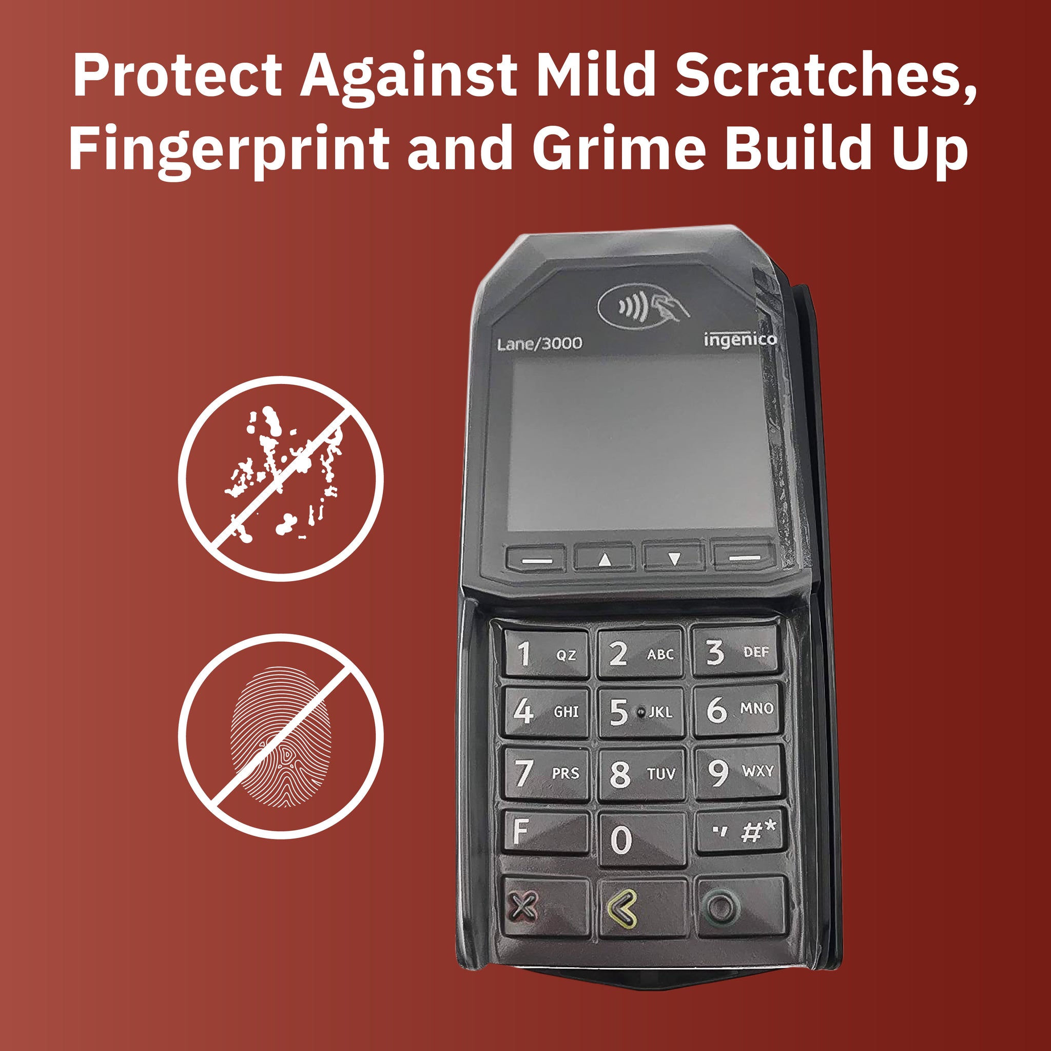 Protective Spill Covers are flexible overlays, custom fitted to the keys. This custom design covers the entire Ingenico Lane/3000 terminal including all around the edges to protect your terminal from germs, liquid spills, dust and dirt.