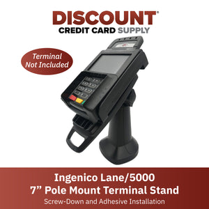 This is a 7” pole mount terminal stand designed for the Ingenico Lane/5000 V2 terminals; stand is a lightweight composite POS system holder; design allows you to securely and invisibly hold the Ingenico Lane/5000 V2 device in place