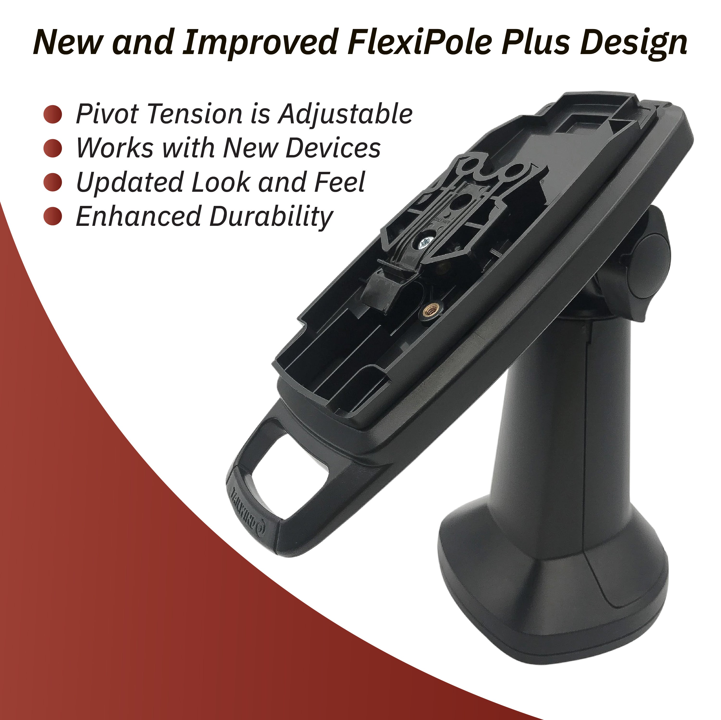 New and improved FlexiPole Plus design brings enhanced durability with an updated look and feel; works with new devices to accommodate cables with large hard-wired connectors; pivot tension is adjustable with user dial