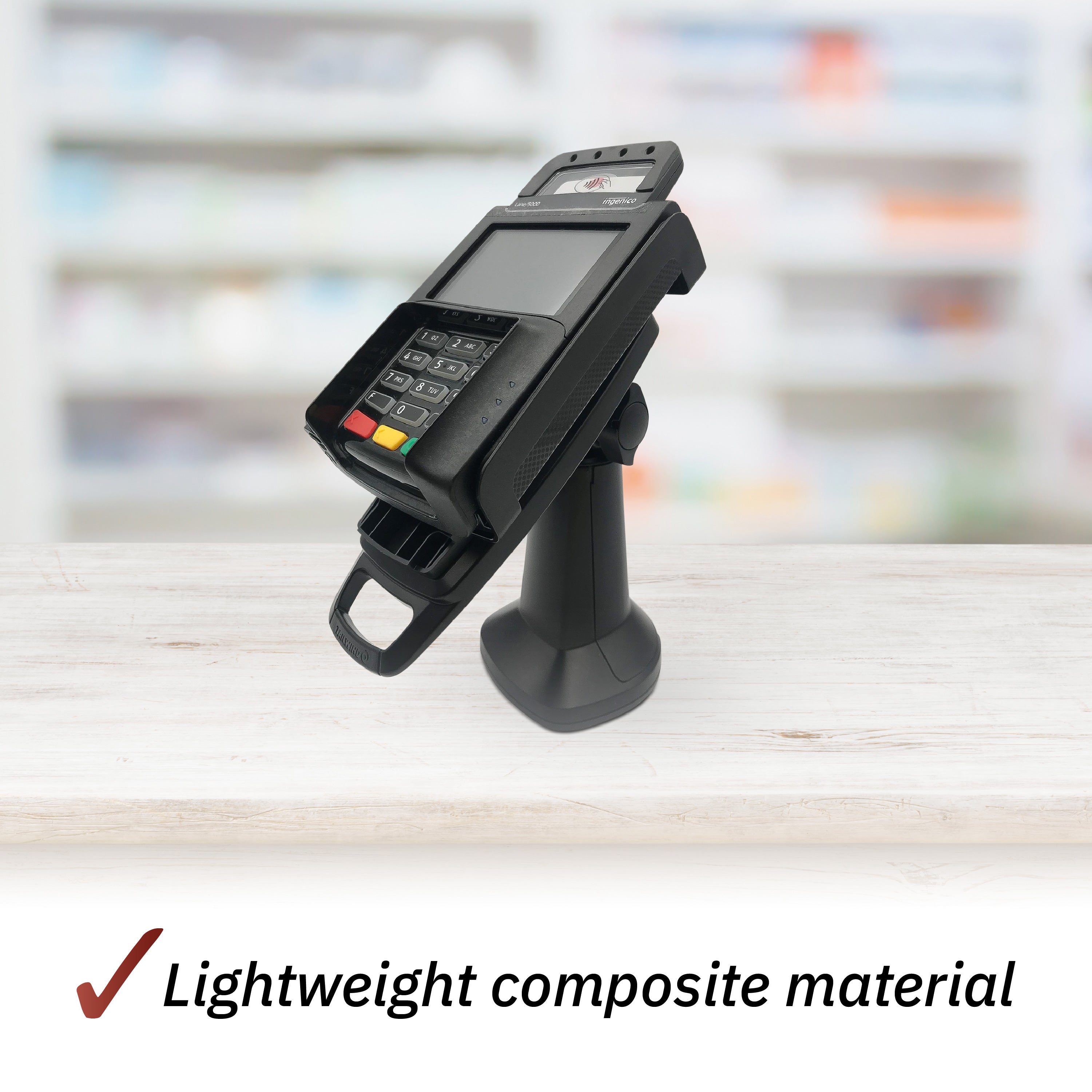 Easy installation using the included adhesive pad and PEDPack for the Ingenico Lane/5000 V2; comes with an adhesive pad to secure your stand to the counter; terminal not included