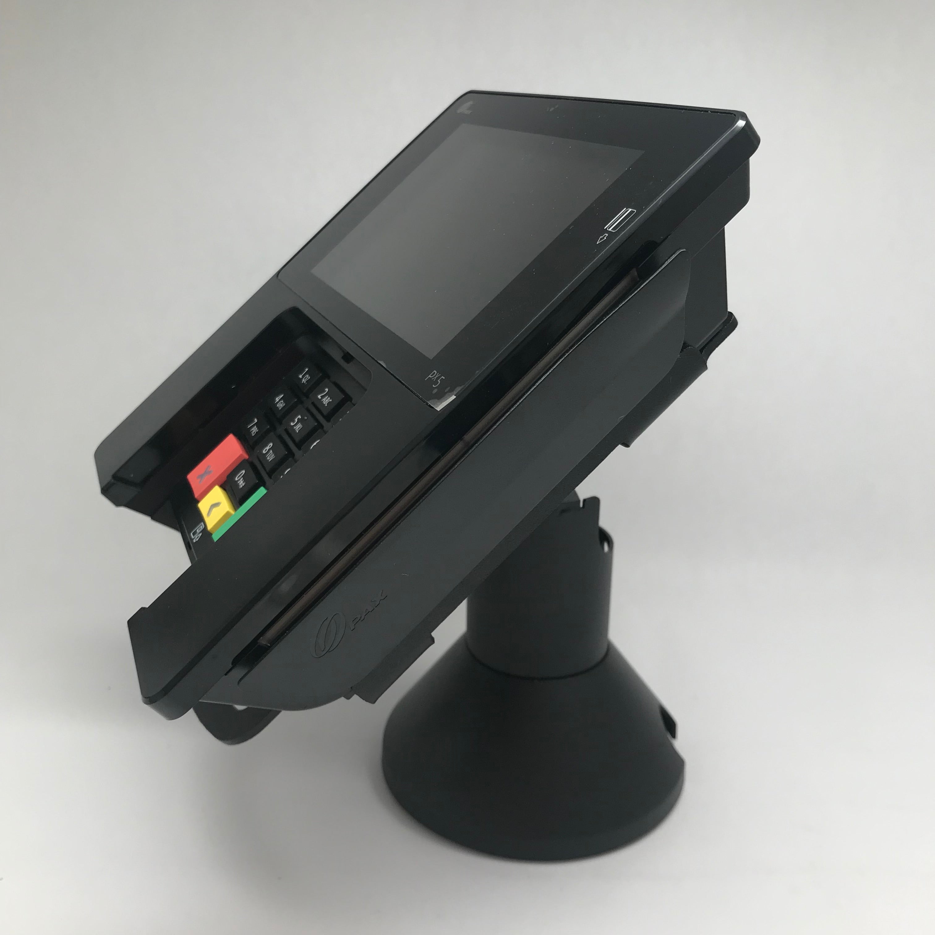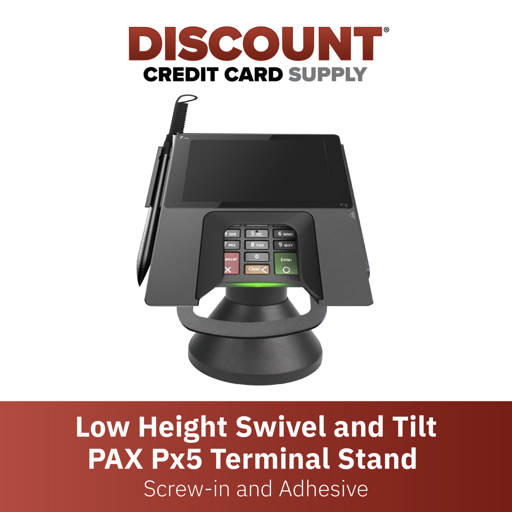 - Swivel and tilt stand is supplied fully built for a simple installation; two easy installation methods; includes screws and an adhesive pad for two options of securing holder; terminal not included; fits PAX Px5; pole stands 4” tall