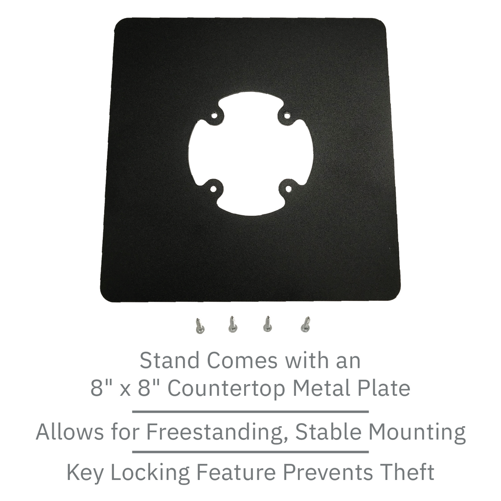 - Includes 8" x 8" square countertop plate which increases flexibility and allows the mount to be freestanding. Simply screw the stand to the plate with enclosed screws.