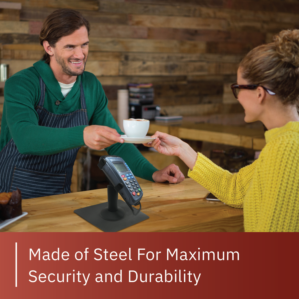- Stand allows for seamless customer interactions with less danger of harm to equipment; flange cover hides wires and mount keeps terminal secure for minimized chances of damage and theft to POS terminal; durable powder coated finish protects stand