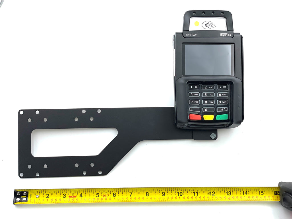 This custom flat mounting bracket brings the payment device next to the 19" - 23" Tablet. The bracket, made of metal with a black coating is secured to the back of the monitor and projects to the left or the right of the monitor. The mount comes with all of the mounting screws for the install. The POS mount on the bracket has holes for both 70mm and 100mm VESA mounts. VESA mounts are the four screw holes that come standard on the back of a monitor/display.
