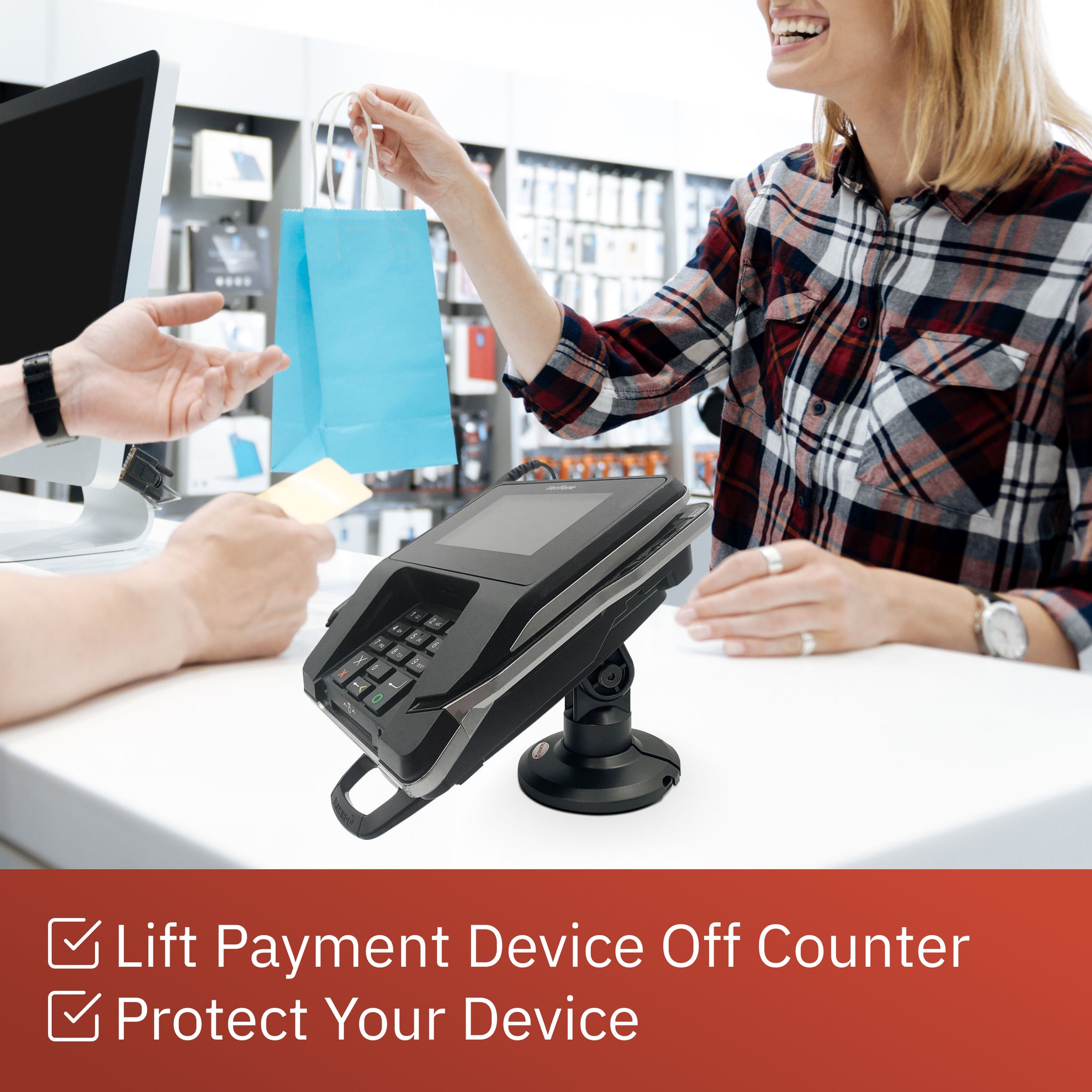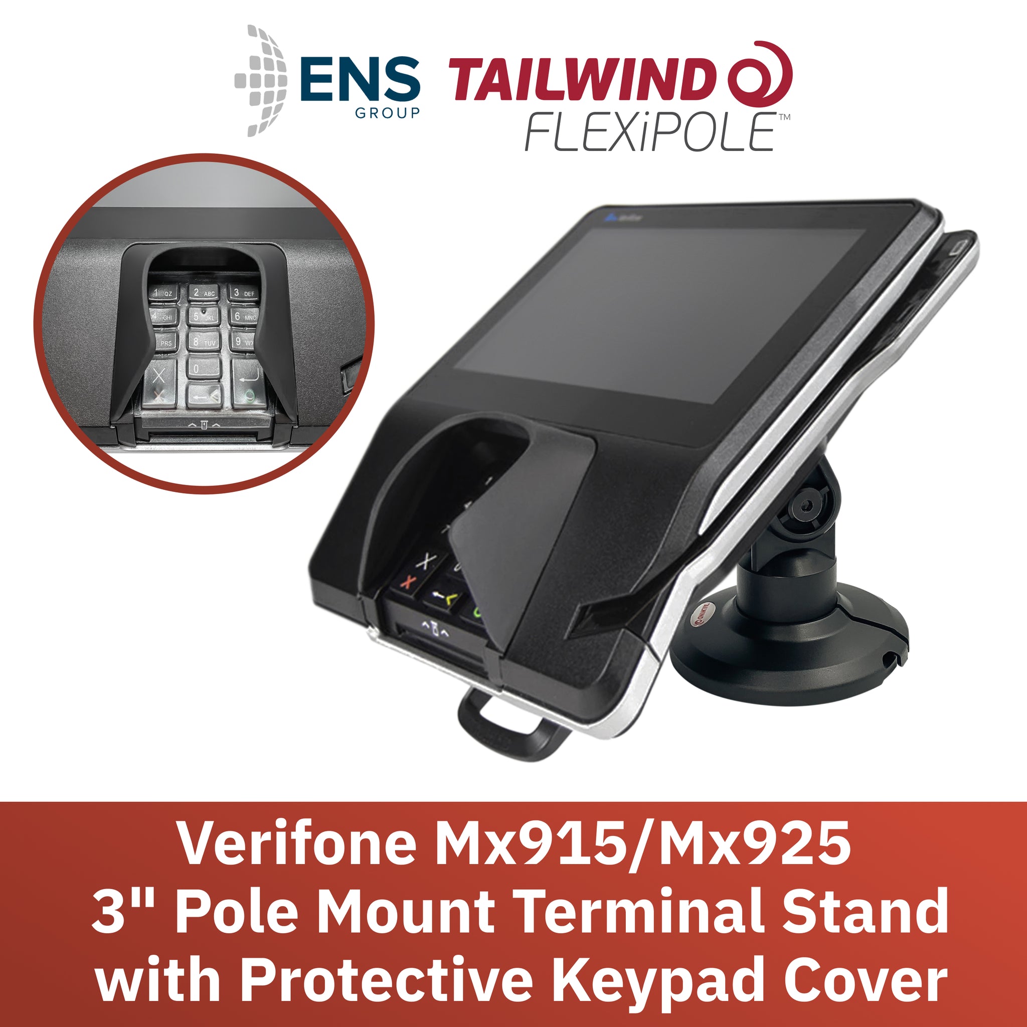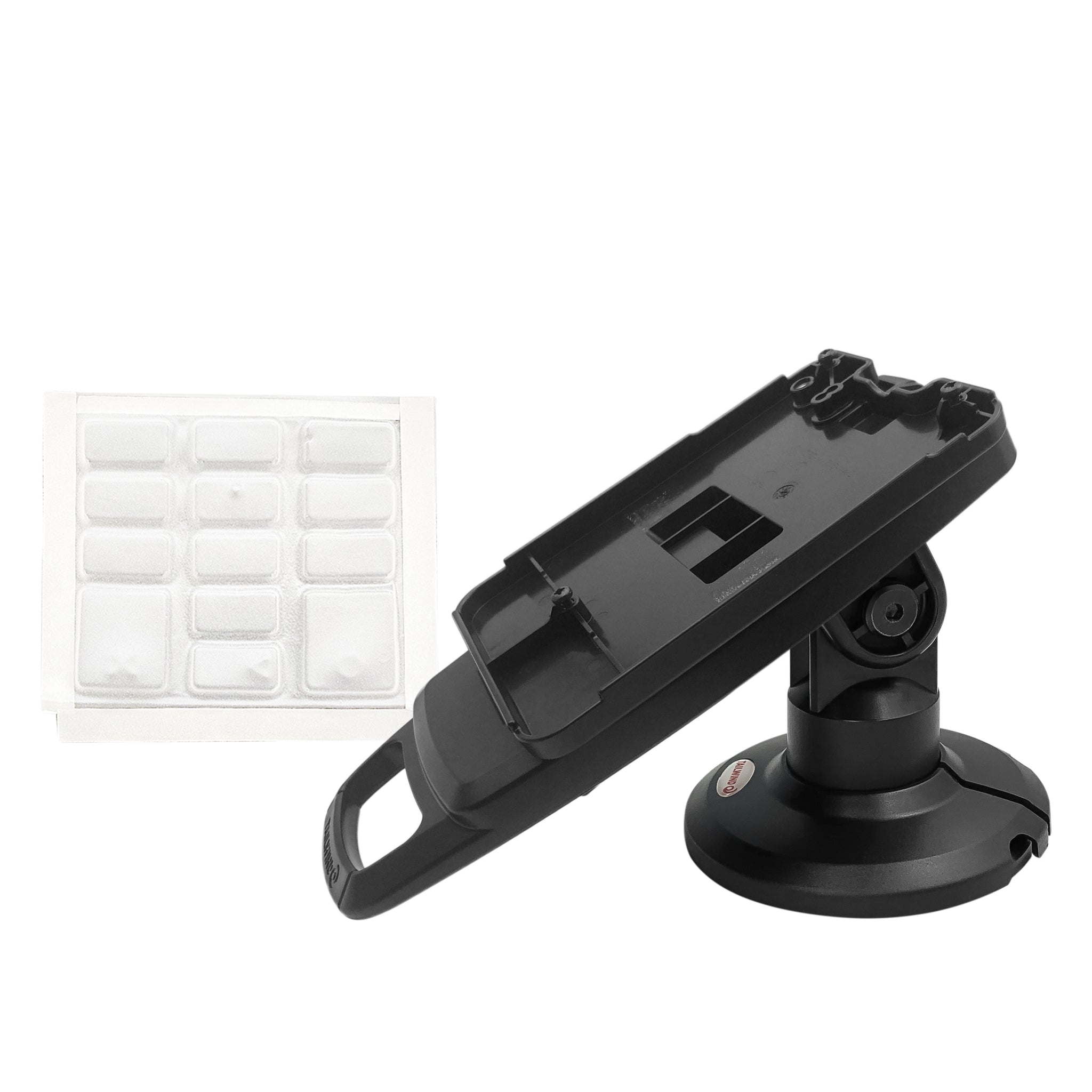 Lower height (3") pole mount with custom back plate designed for the Verifone Mx915/Mx925. Securely and invisibly holds the device in place. Tilts 140°. Includes pole mount with adhesive pad. PEDPack for the Verifone Mx915/Mx925. Made of black composite plastic material. Part #ASS90121. Terminal Not Included.