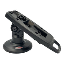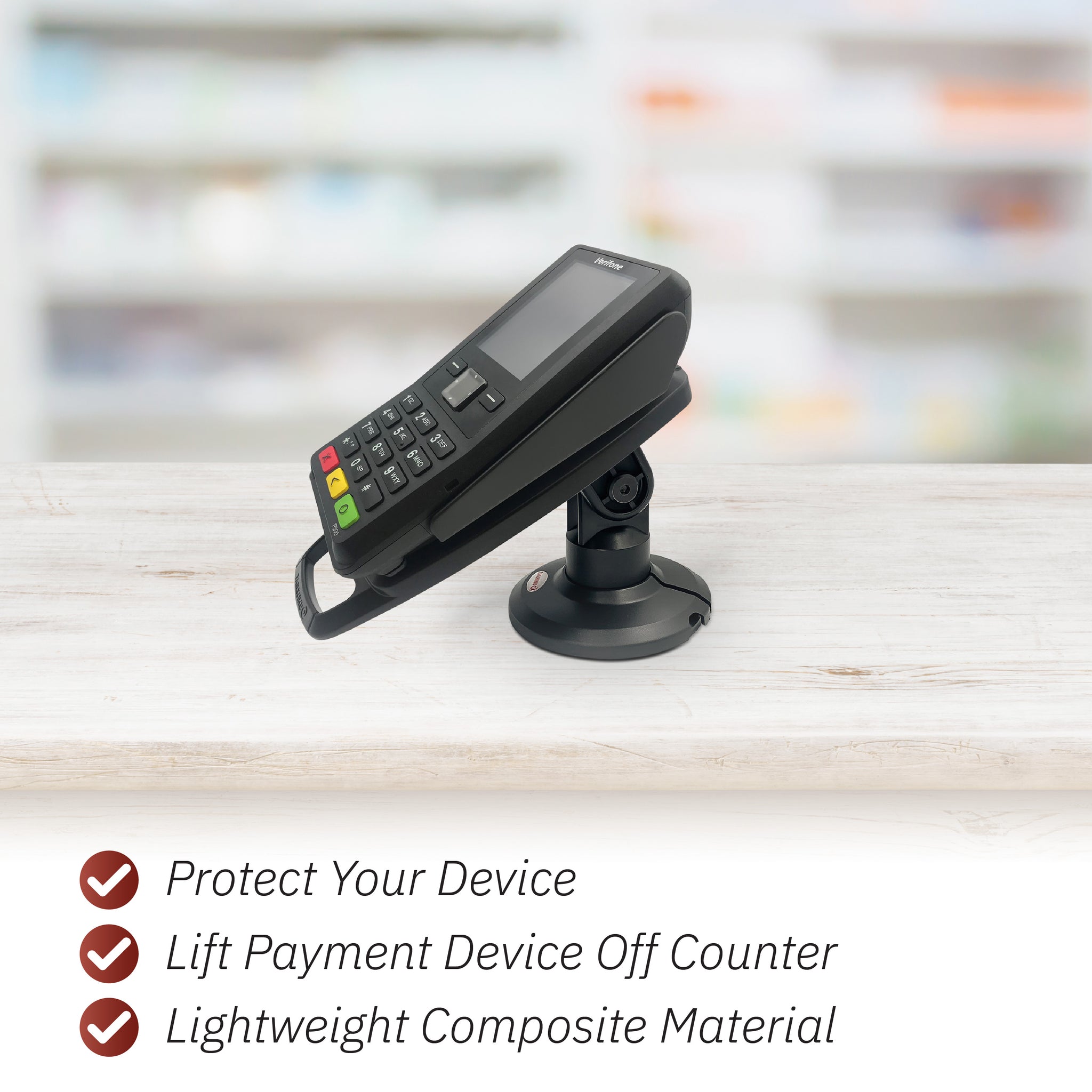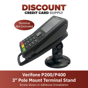 Lower height (3") pole mount with custom back plate designed for the Verifone P200/P400. Securely and invisibly holds the device in place. Tilts 140°. Includes pole mount with adhesive pad. PEDPack for the Verifone P200/P400. Made of black composite plastic material. Terminal Not Included.