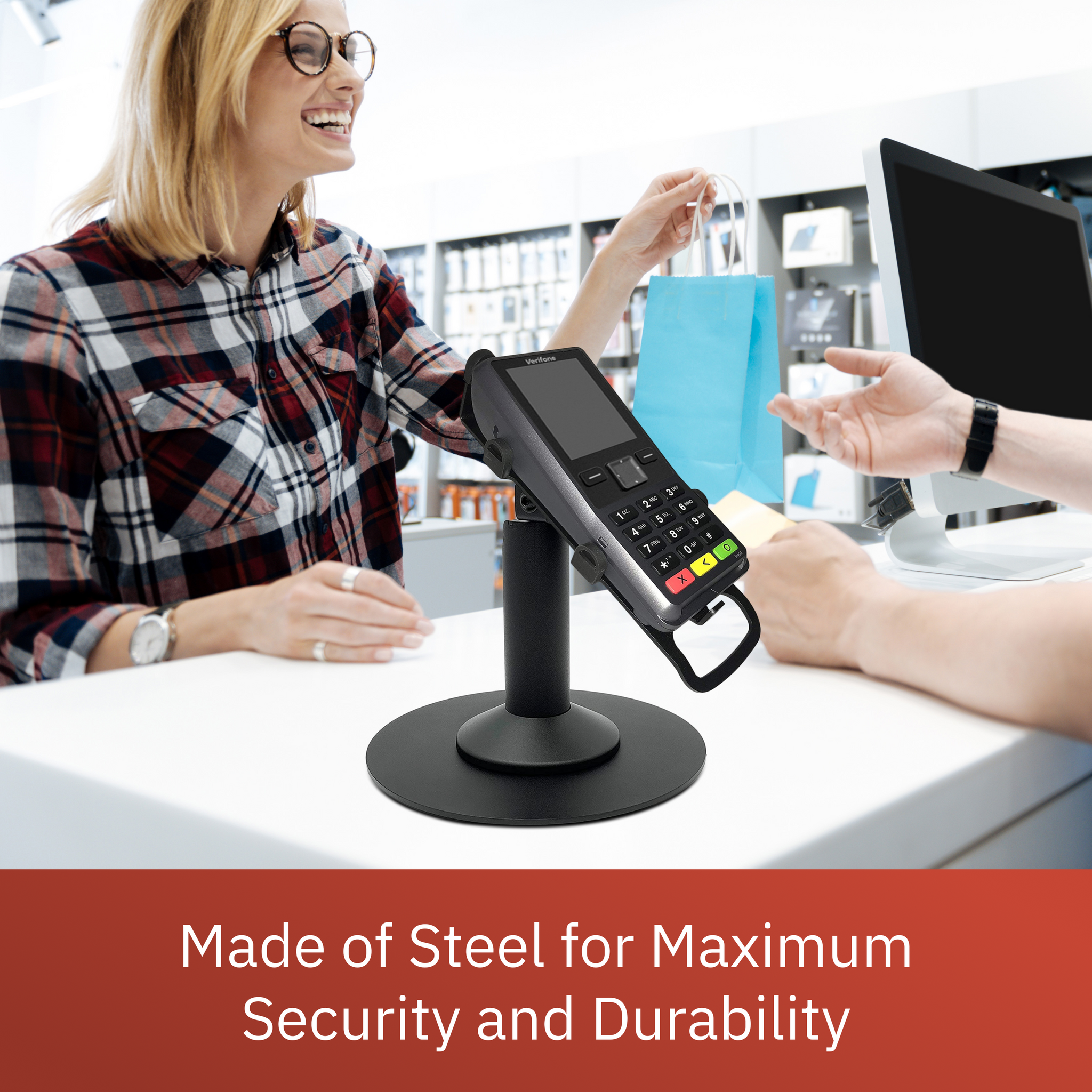 - Stand allows for seamless customer interactions with less danger of harm to equipment; flange cover hides wires and mount keeps terminal secure for minimized chances of damage and theft to POS terminal; durable powder coated finish protects stand