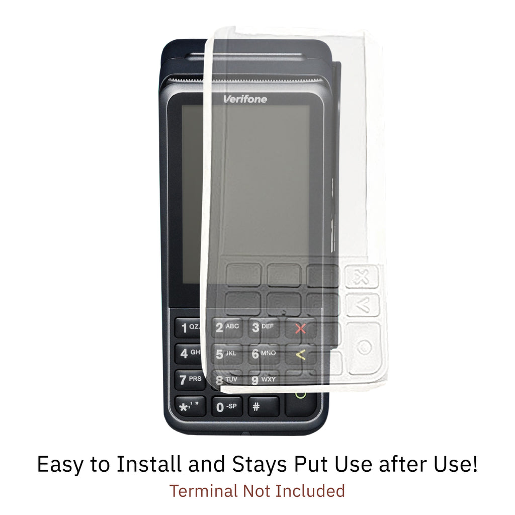 Protective Spill Covers are flexible overlays, custom fitted to the keys. This custom design covers the entire Verifone V400M terminal including all around the edges to protect your terminal from germs, liquid spills, dust and dirt.