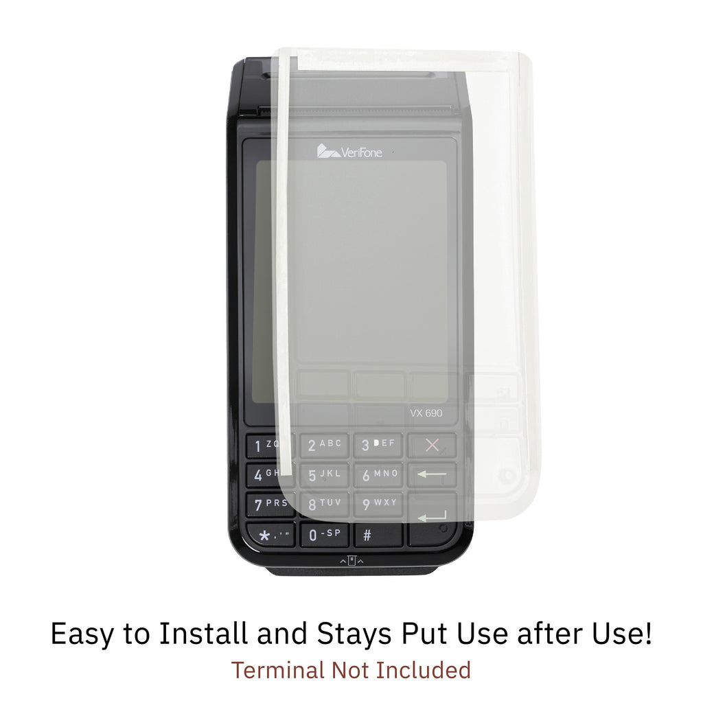 Protective Spill Covers are flexible overlays, custom fitted to the keys. This custom design covers the entire VeriFone VX 690 terminal including all around the edges to protect your terminal from germs, liquid spills, dust and dirt.