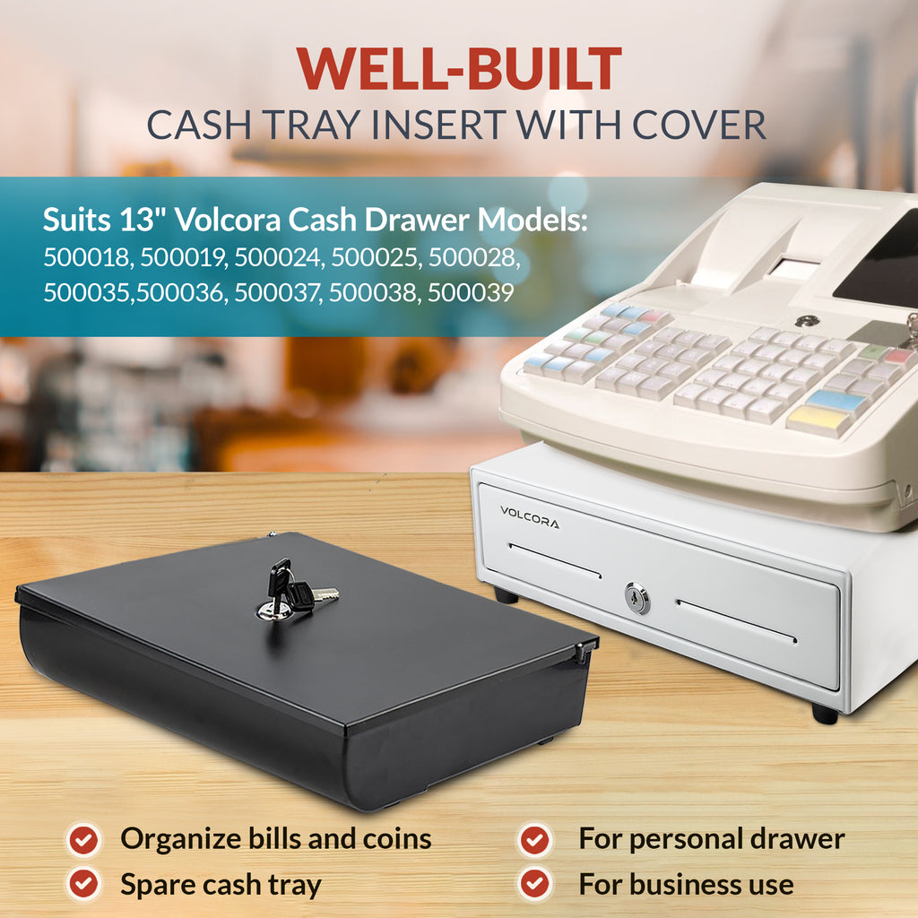 - Fits Volcora 13" Cash Drawer for part #: 500018, 500019, 500024, 500025, 500028, 500035, 500036, 500037, 500038, and 500039