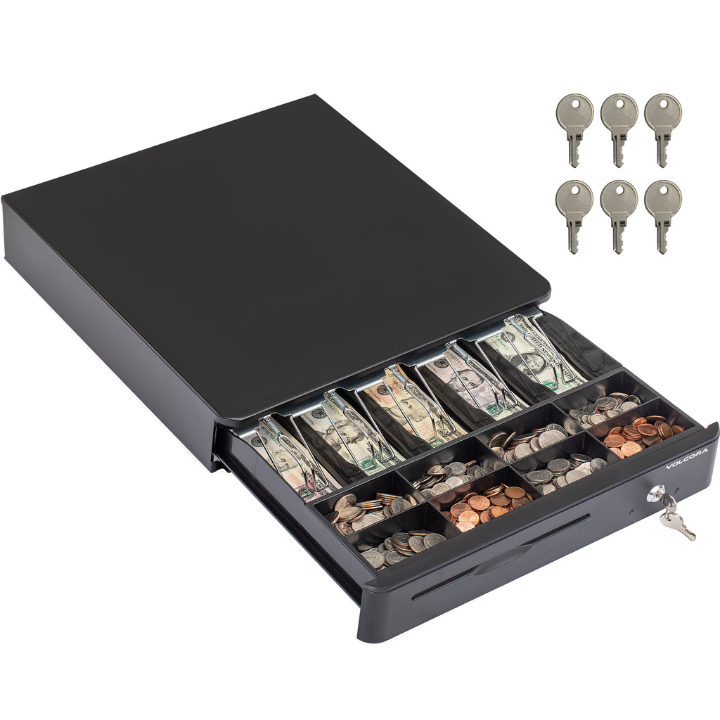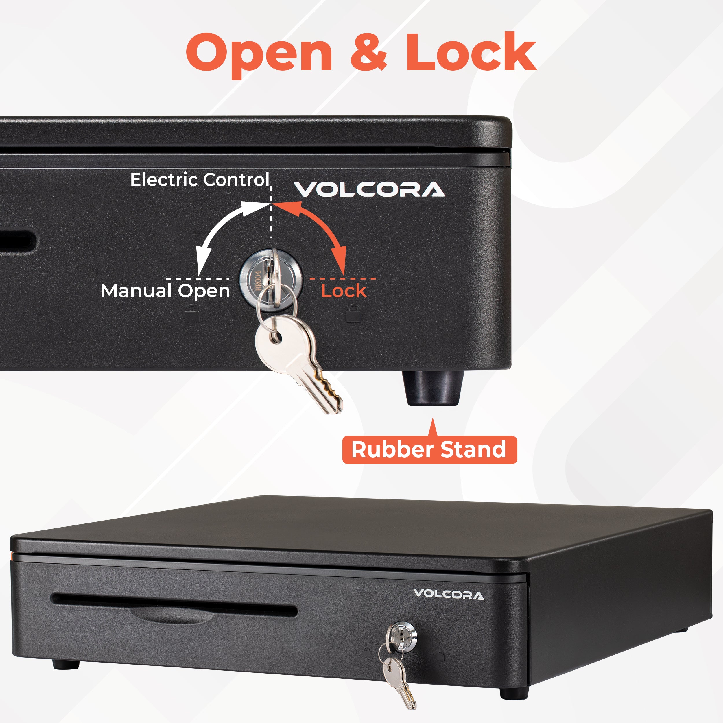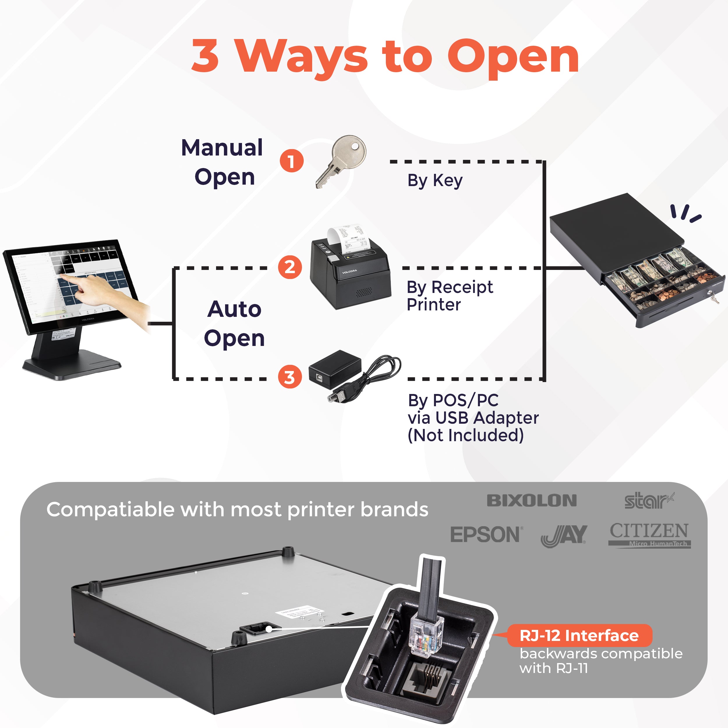 - 3-position key lock: 1-manual open, 2-auto open by printer/POS, 3-lock